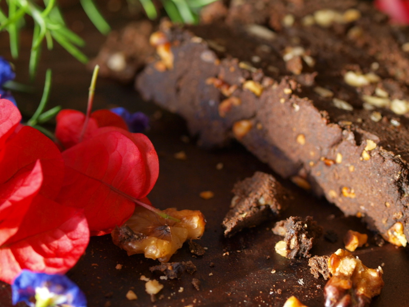 Farinha de trigo sarraceno, água, açúcar de côco, alfarroba, goma xantana, fermento seco, raspa de laranja, flor de sal e nozes. Variações a serem testadas nos próximos dias. Por cá e em Lisboa.