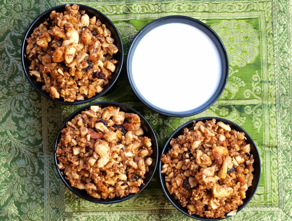 Por vezes, apetecem-me outras coisas como granola com leite de côco (caseiro, naturalmente). A granola que faço agora já não leva cereais. Não tem açúcar adicionado (apenas aquele que está naturalmente presente nos ingredientes usados e que já não é pouco), é bastante densa e pouco doce. Resumindo, esta granola deve ser consumida com moderação. Uma colher de sopa bem cheia com uma taça de leite de côco e frutas silvestres já me deixa mais do que satisfeita.